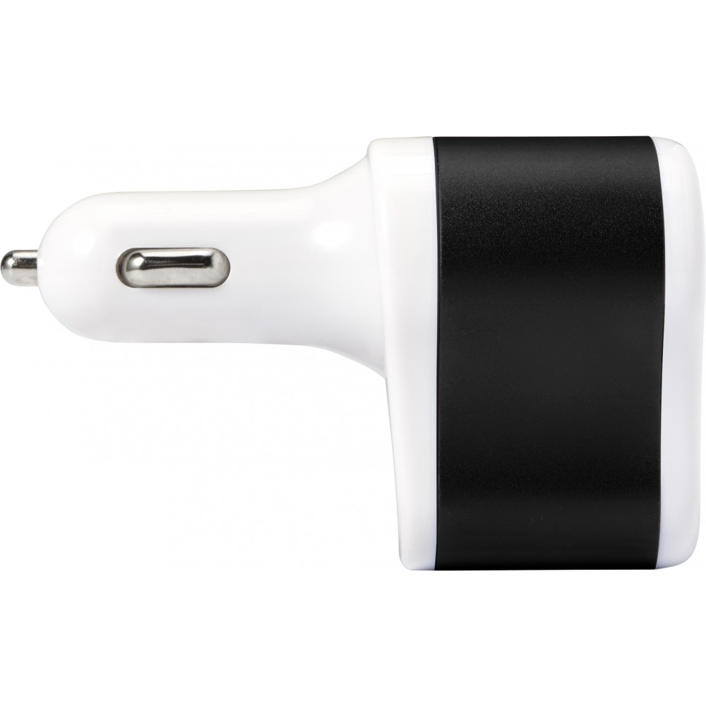 Autós töltő 2 USB csatlakozóval, alumínium szivargyújtóval. Bemenet 12V-24V, kimenet 5V-2100 mA. Műanyag.