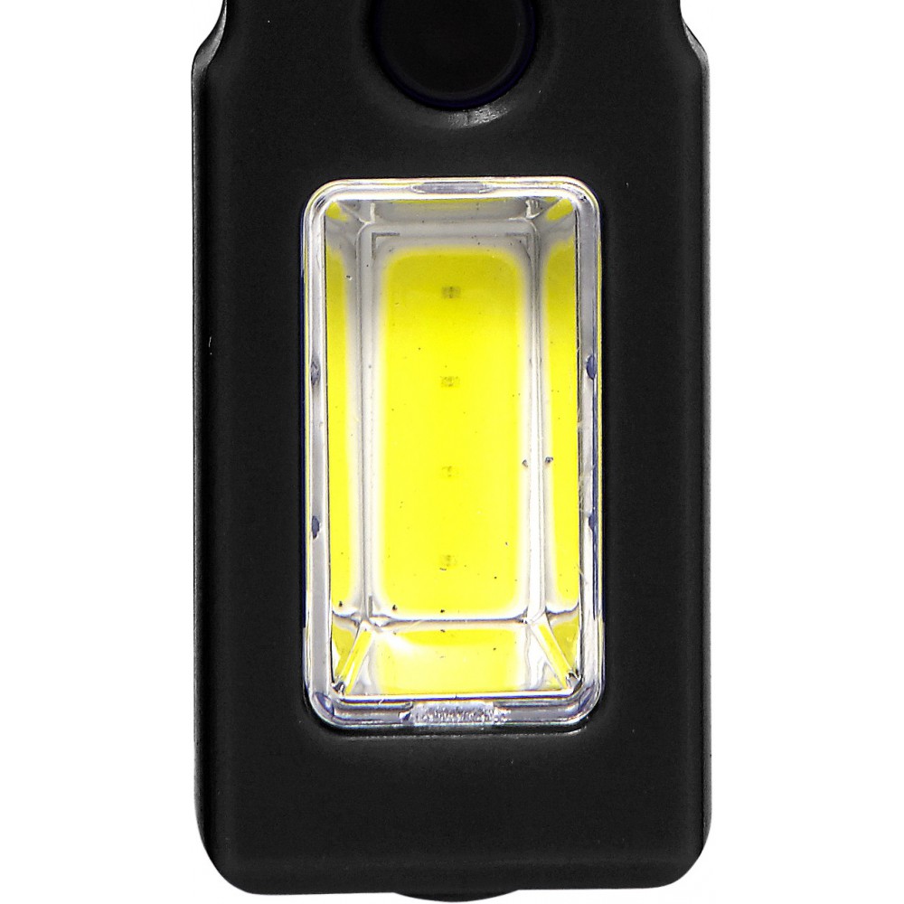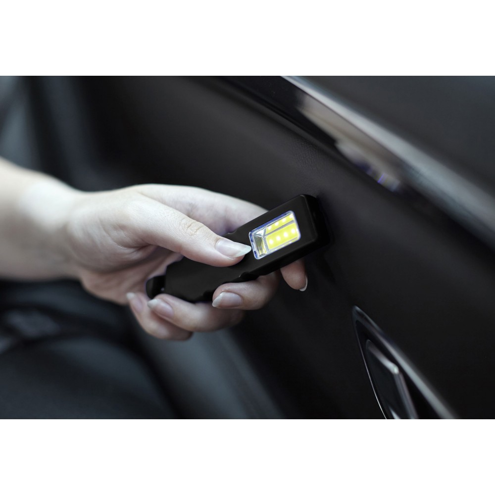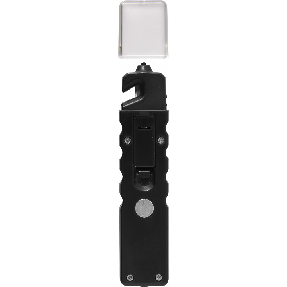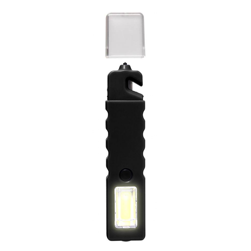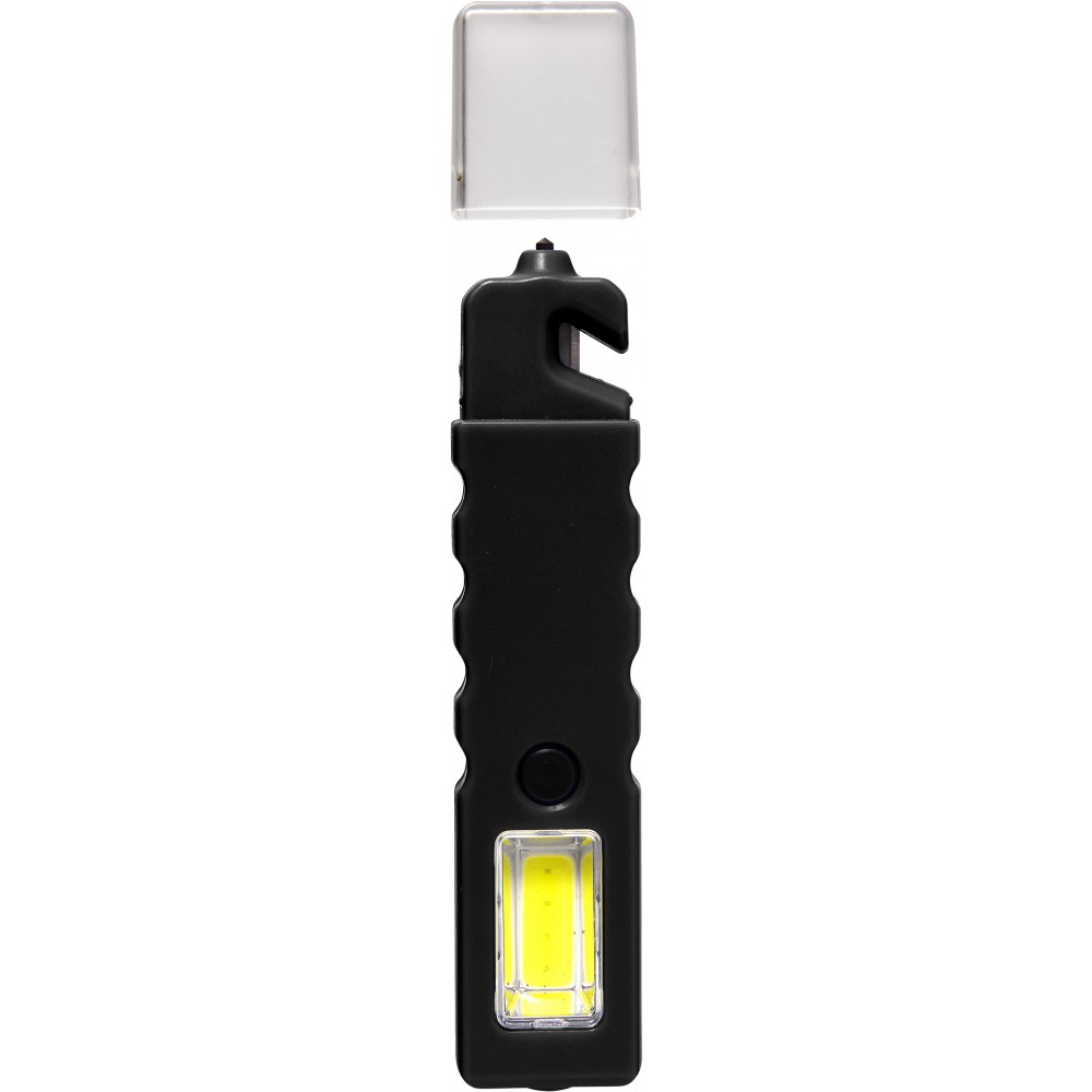 Többfunkciós autósszerszám mágnessel. COB-lámpa villogó móddal, valamint vészhelyzeti ablaktörő, biztonságiöv-vágó védőkupakkal. Az elemet tartalmazza.