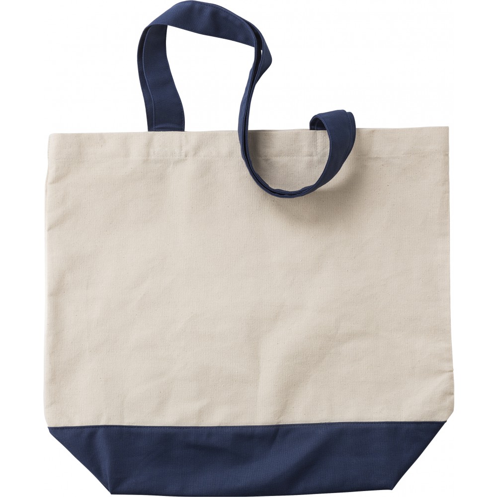 Bevásárlótáska vagy strandtáska belső zsebbel, színes füllel és alsó résszel. 280 g/m2 vászon anyag.