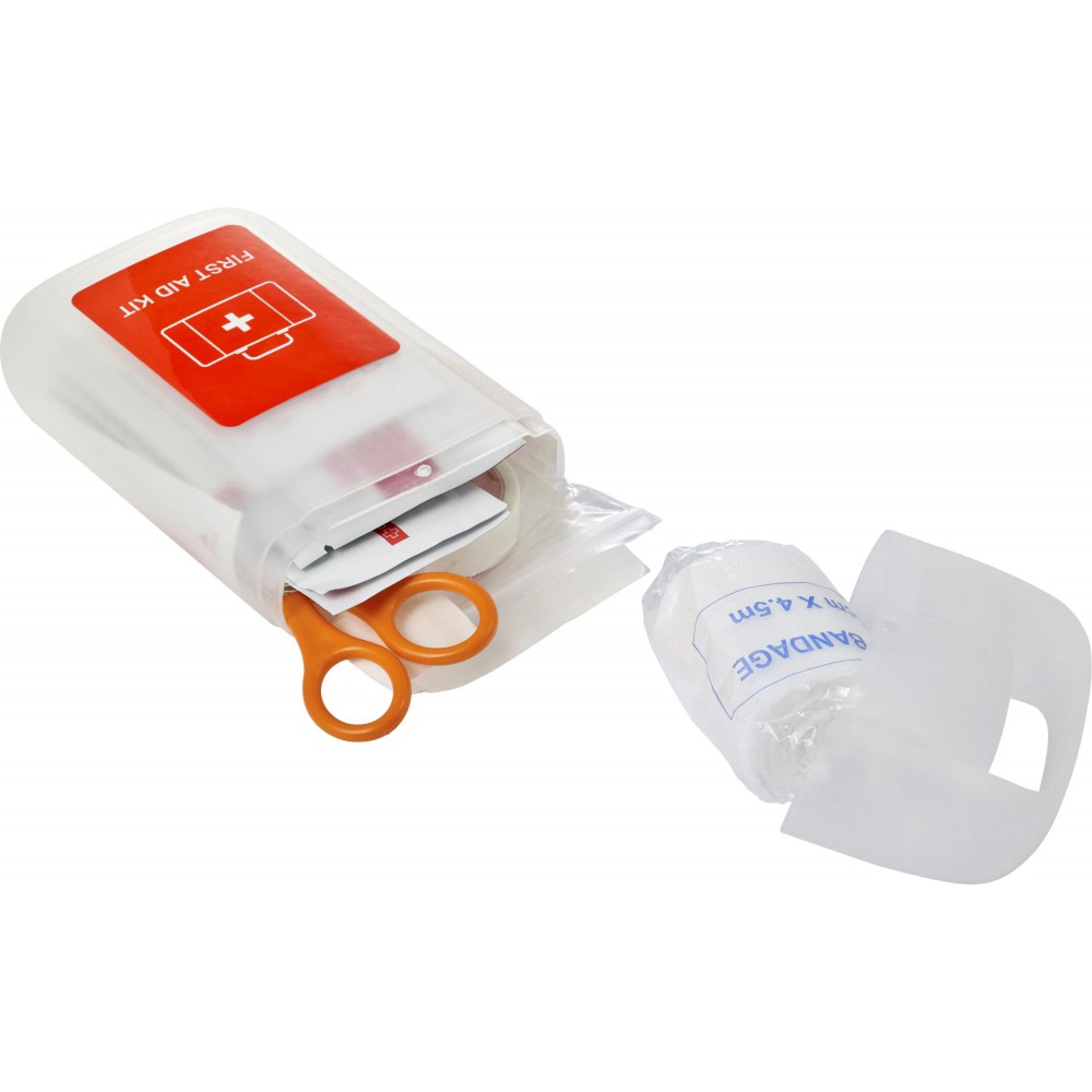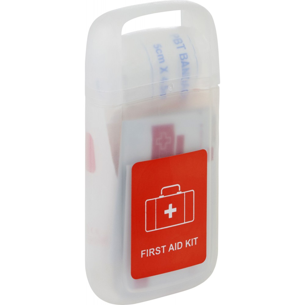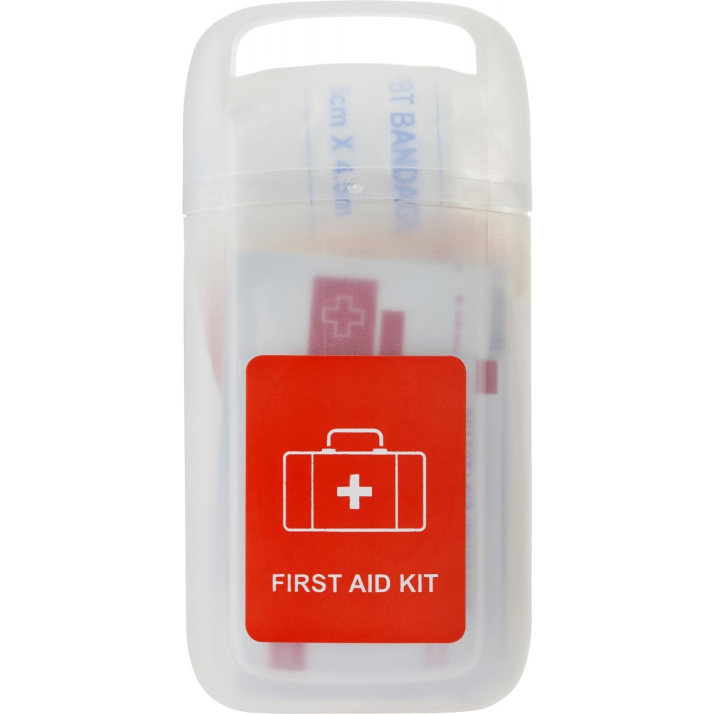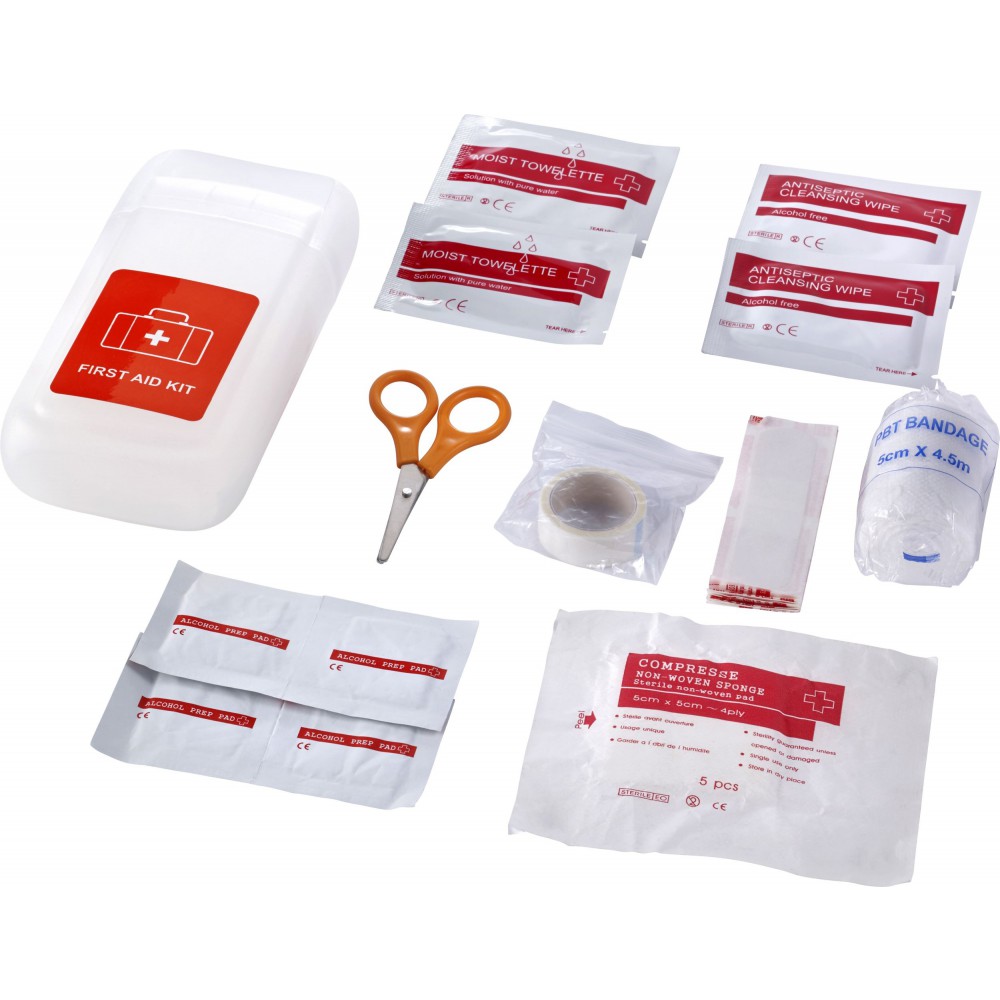 Elsősegélykészlet PP műanyag átlátszó tartóban. A készlet tartalma: 1 db kötés, 1db nemszőtt szivacs, 5 db steril kötés, 1 db PBT kötés, 4 db alkoholos fertőtlenítő, 2 db nedves törlőkendő, 1 db fertőtlenítő kendő, ragtapasz és 1 db olló. PP