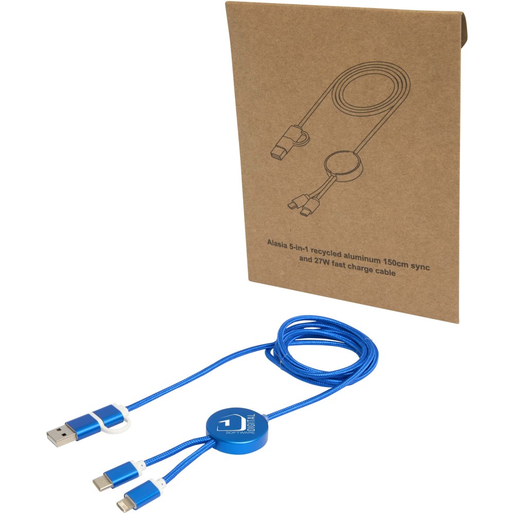 Az Alasia 5 az 1-ben adat- és 27W-os gyorstöltő kábel tartós és elegáns újrahasznosított alumíniumból és műanyagból készült. A kábel USB-A és Type-C bemeneti csatlakozókkal, valamint Type-C és Lightning/Micro USB kombinált kimeneti csatlakozóval rendelkezik. Az USB-A?USB-C kapcsolat maximális teljesítménye 27W, míg az összes többi kapcsolat maximális teljesítménye 15W. Kompatibilis a CarPlay és az Android Auto rendszerekkel. Akár otthon, az irodában vagy útközben használod, az Alasia kábel teljesítményt és stílust garantál. Kábel hossza: 150 cm.