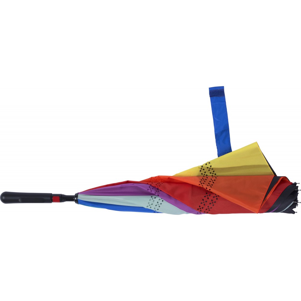 Kifordítható automata esernyő nyolc panellel, fém vázzal, üvegszálas bordázattal, műanyag nyéllel, kétrétegű ernyővel: fekete felső és színes belső vászon. 190T, üvegszál, PVC, vas.