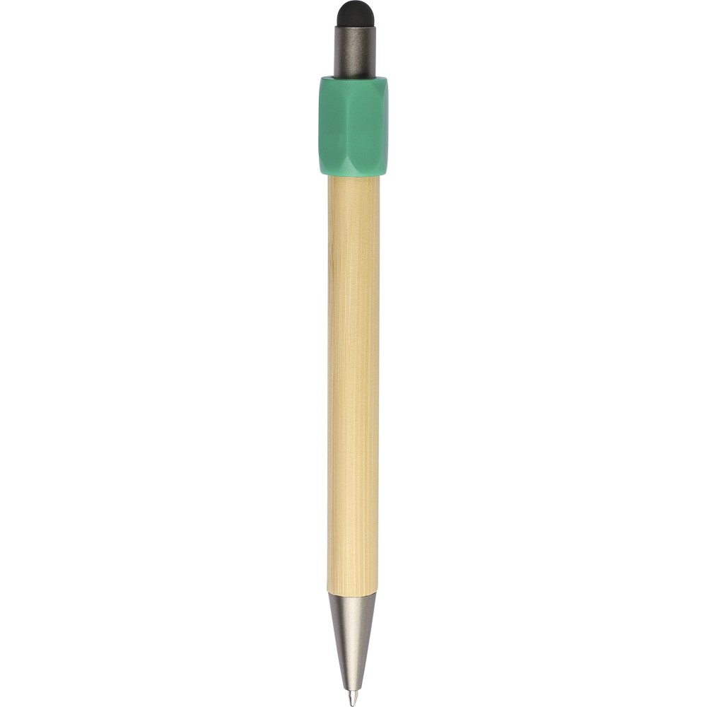 Bambusz golyóstoll újrahasznosított ABS pörgettyűvel és fekete érintővel a nyombógombon. A tollhegy vastagsága 1.0 mm, íráshossz: kb. 800 méter. Az újrahasznosított anyagra utaló logó a tollra van gravírozva.