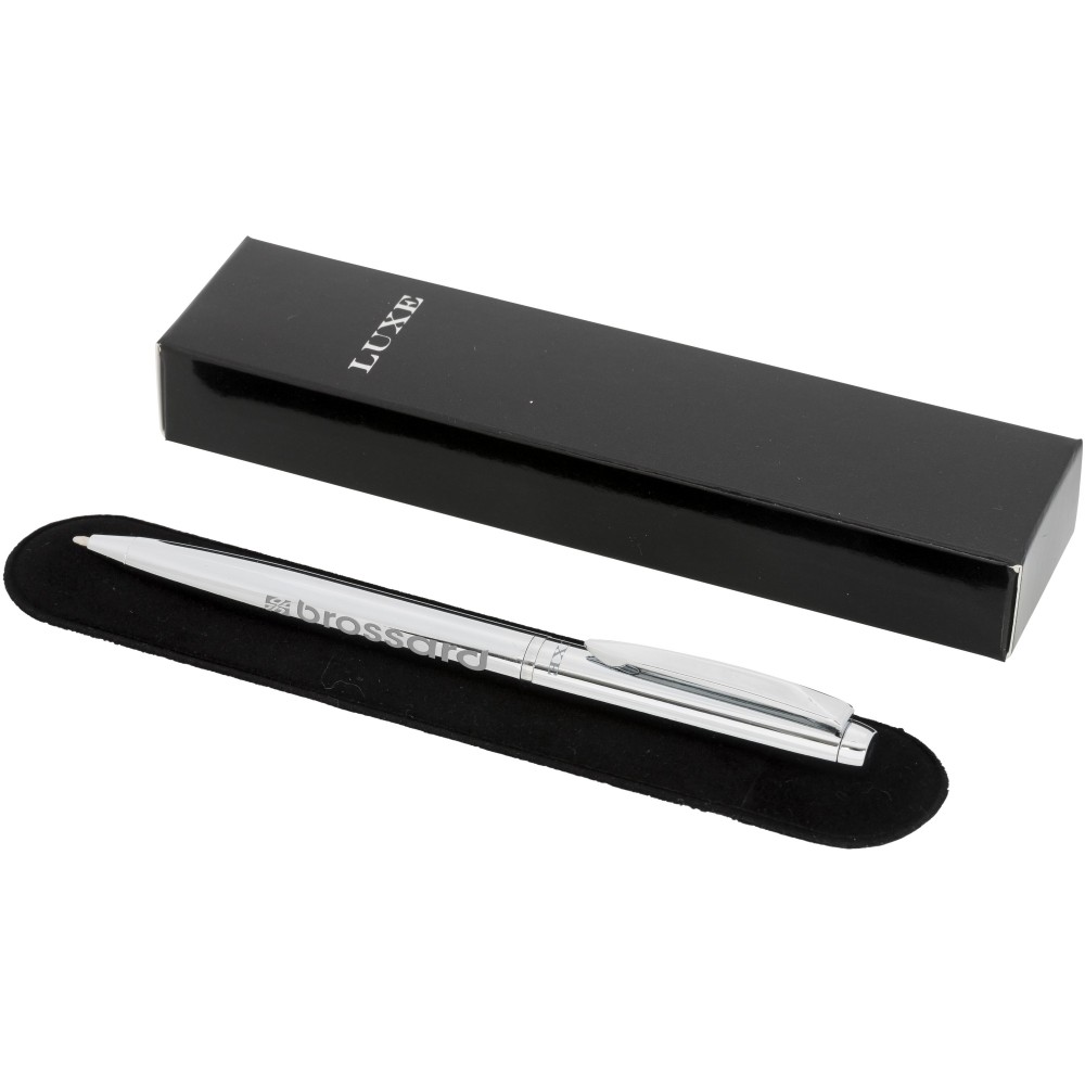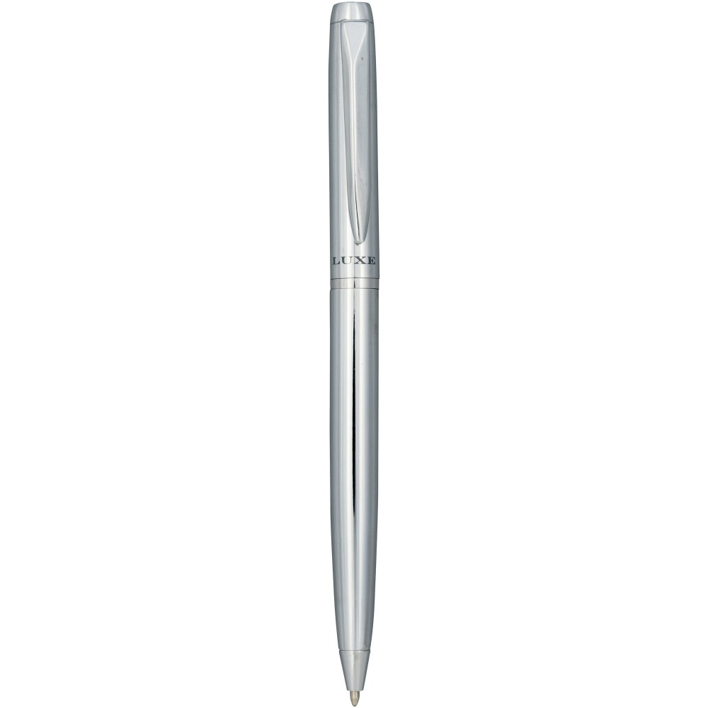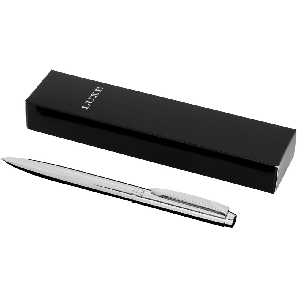 Kifinomult tervezésű golyóstoll krómozott vagy színes alsó résszel és fényes krómozott részletekkel. Prémium minőségű fekete tollbetéttel. Csomagolása Luxe ajándékdoboz.Fém.