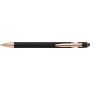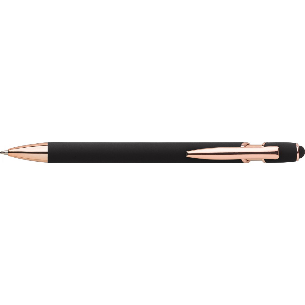 Alumínium golyóstoll rózsaarany részletekkel és érintővel, kék tollbetéttel.