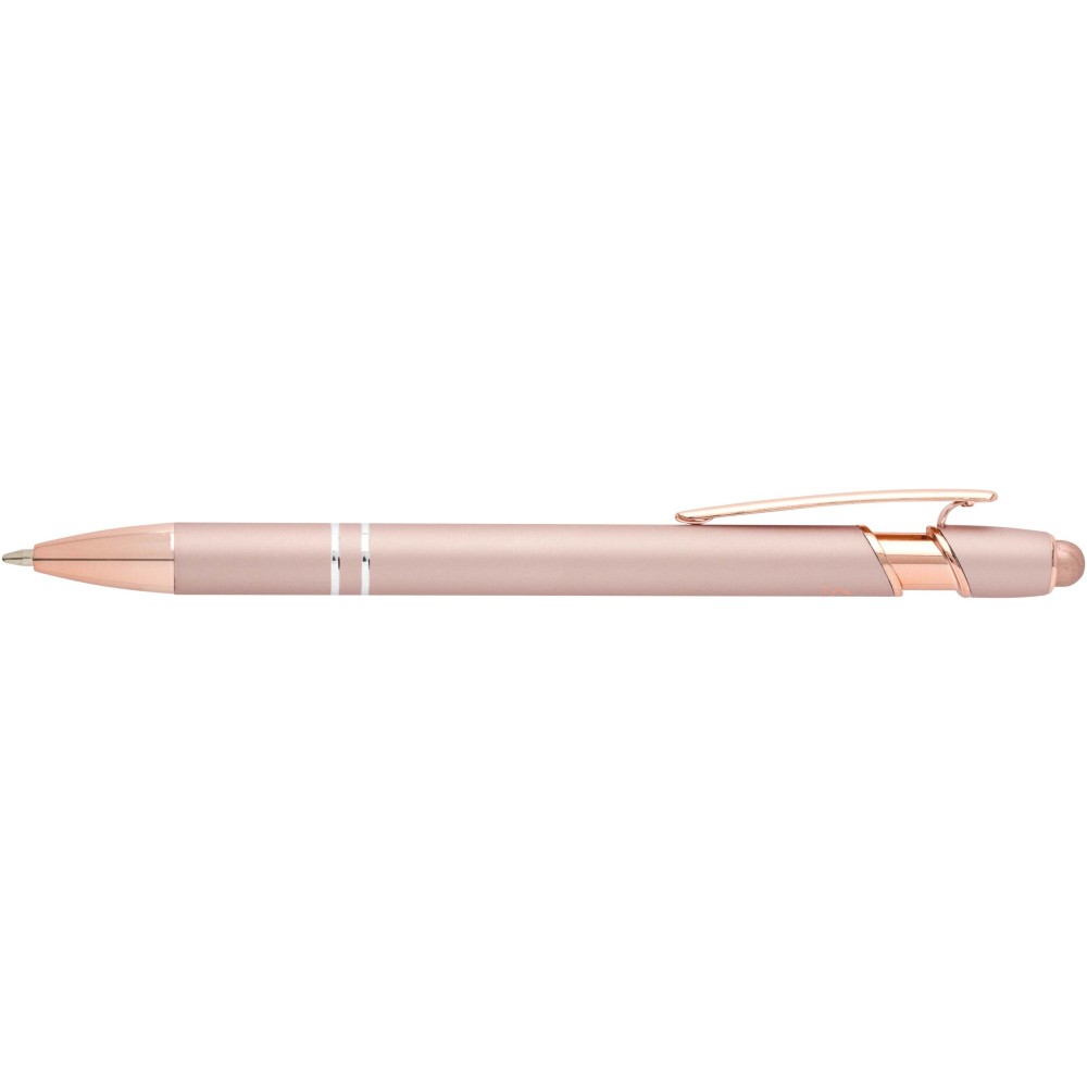 A Nanna golyóstoll rózsaarany bevonattal újrahasznosított alumíniumból készült tolltesttel és szilikon, érintőképernyős véggel rendelkezik. Az újrahasznosított alumínium csökkenti a hulladék mennyiségét a lerakókban, hozzájárul a természeti erőforrások megőrzéséhez és a károsanyag-kibocsátás mérsékléséhez. Tinta színe: fekete. Íráshossz: 800 méter. Tollhegy mérete: 1,0 mm.