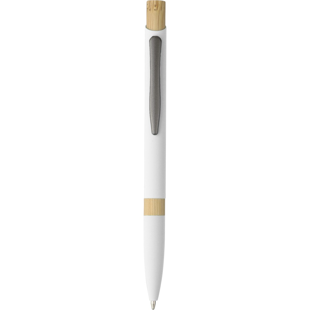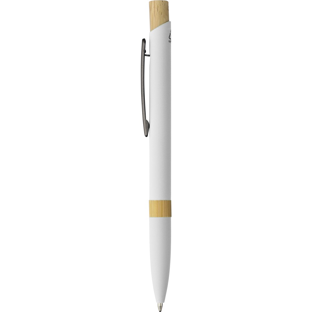 Golyóstoll újrahasznosított alumíniumból, gumírozott bevonattal, bambusz nyomógombbal és bambusz gyűrűvel a tolltesten. Kék tollbetéttel. A tollhegy vastagsága 1.0 mm, íráshossz: kb. 800 méter. Az újrahasznosított anyagra utaló logó a tollra van gravírozva.