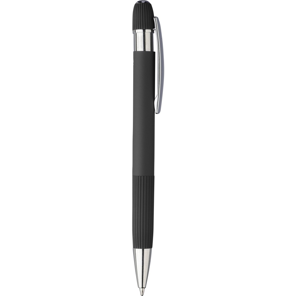 Újrahasznosított alumínium golyóstoll gumírozott felülettel. Bordázott részletekkel a markolaton és a tetején, krómozott műanyag heggyel és fém klipsszel ellátott nyomógombbal. Lézergravírozott újrahasznosított logóval. Kék tintával.