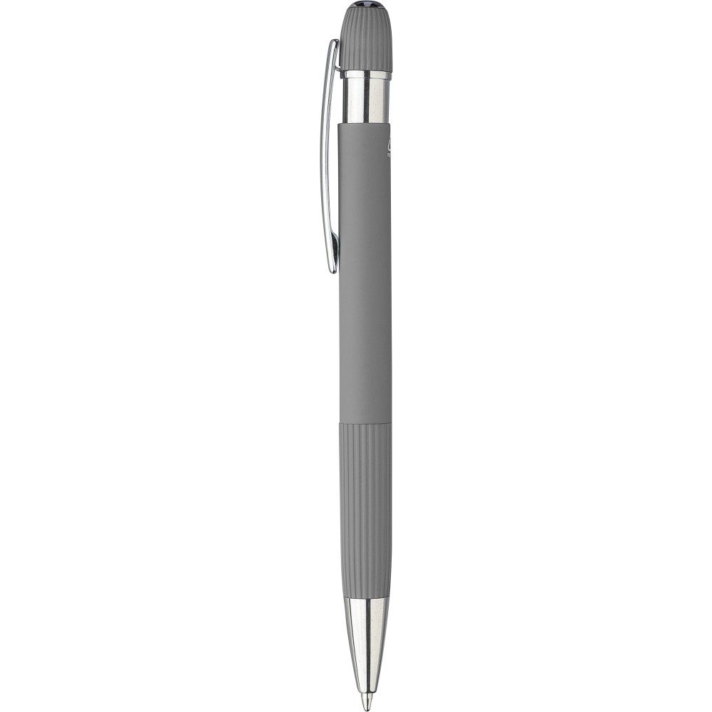 Újrahasznosított alumínium golyóstoll gumírozott felülettel. Bordázott részletekkel a markolaton és a tetején, krómozott műanyag heggyel és fém klipsszel ellátott nyomógombbal. Lézergravírozott újrahasznosított logóval. Kék tintával.