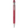 Újrahasznosított alumínium golyóstoll gumírozott felülettel. Bordázott részletekkel a markolaton és a tetején, krómozott műanyag heggyel és fém klipsszel ellátott nyomógombbal. Lézergravírozott újrahasznosított logóval. Kék tintával.