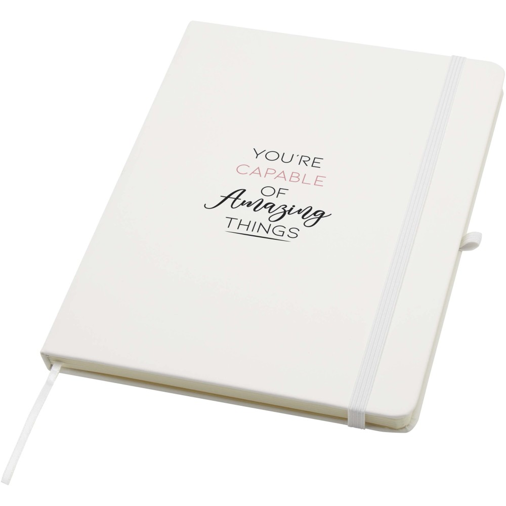 A Spectrum Plus A5 keményfedeles jegyzetfüzet lekerekített sarkokkal nemcsak az irodai mindennapok elengedhetetlen kelléke, hanem remek lehetőség márkád népszerűsítésére is. A jegyzetfüzet puha tapintású borítóval rendelkezik és 80 vonalas, krémszínű, 70 g/m2-es lapból áll, amely tökéletes gyors ötletek vagy hosszabb jegyzetek rögzítésére. A jegyzetfüzet tolltartó hurokkal, gumiszalagos záródással, könyvjelzővel és harmonikazsebbel van ellátva.