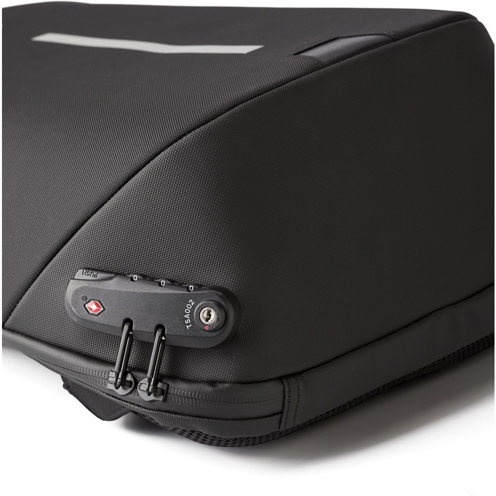 Hátizsák több belső zsebbel, párnázott rész a 15"-es laptop számára, párnázott, állítható vállpánt. 3 karakteres számkonbinációs lakat, fém fül, USB port és vezeték, fényvisszaverő csík, könnyített súlyeloszlást biztosító kialakítás. 1200D nylon anyag.