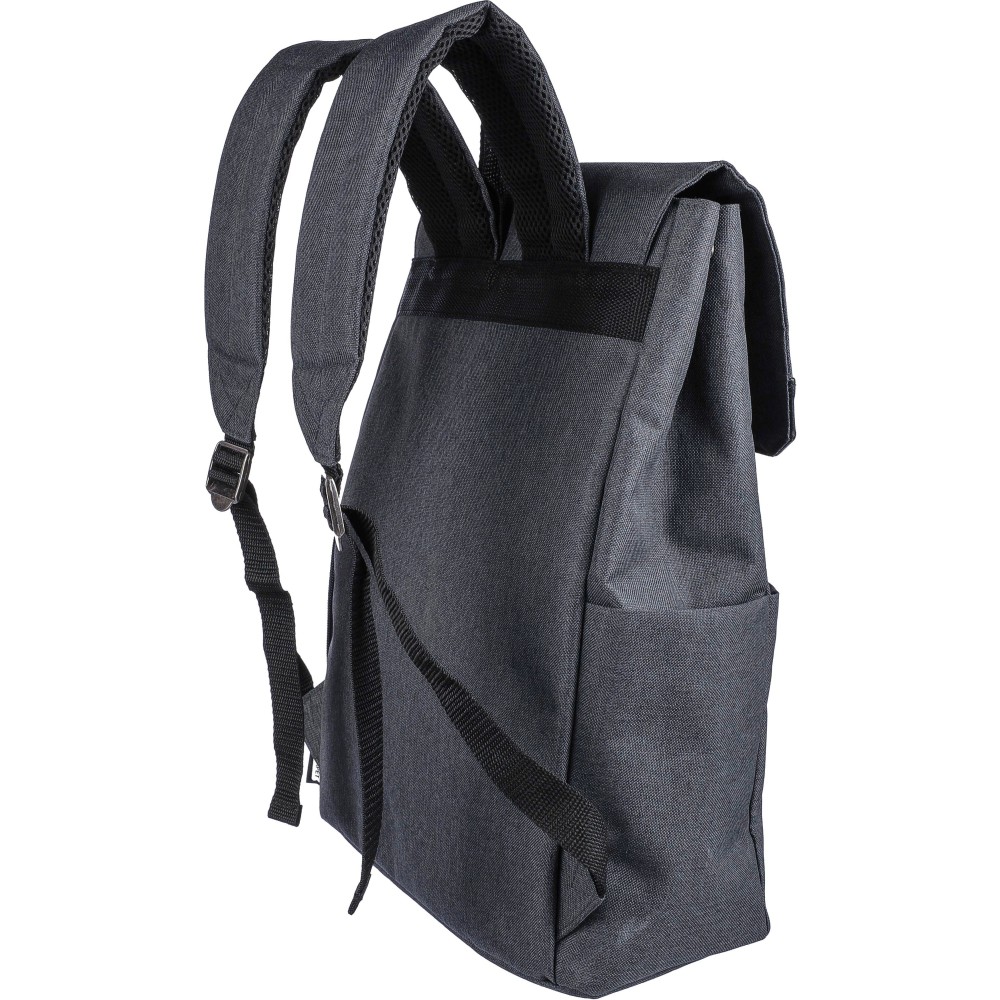 Laptophátizsák 15"-es laptop számára, PVC részletekkel és 210D béléssel. Kis cipzáras elülső zsebbel rendelkezik, benne egy kulcsokhoz rögzíthető karabinerrel, egy cipzáras oldalzsebbel, egy normál oldalzsebbel, valamint egy nagy, mágneszáras rekesszel, amely laptopzsebet tartalmaz. Oldalt nyomógombokkal zárható, ha nincs teljesen megtöltve. Állítható, szellőző pántokkal. Az elülső részen rPET anyagra utaló címke található. Anyaga: 600D poliészter vászon.