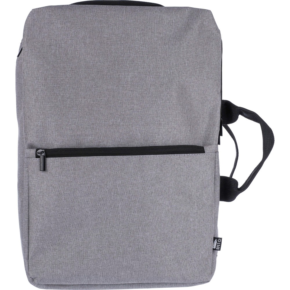 Hátizsák és laptoptáska 15"-es készülékhez. Kézipoggyász méretű. Hordozófüllel a tetején, állítható vállpántokkal és két oldalsó fogantyúval. Az állítható pántok a párnázás mögé rejthetők, így az oldalsó fogantyúkkal is hordozható. Tépőzáras laptoprekesszel és kis cipzáras zsebbel rendelkezik. Szellőző, párnázott hátoldallal. Terhelhetősége kb. 8 kg. RPET alapanyagra utaló címkével. Anyaga: 300D RPET poliészter.