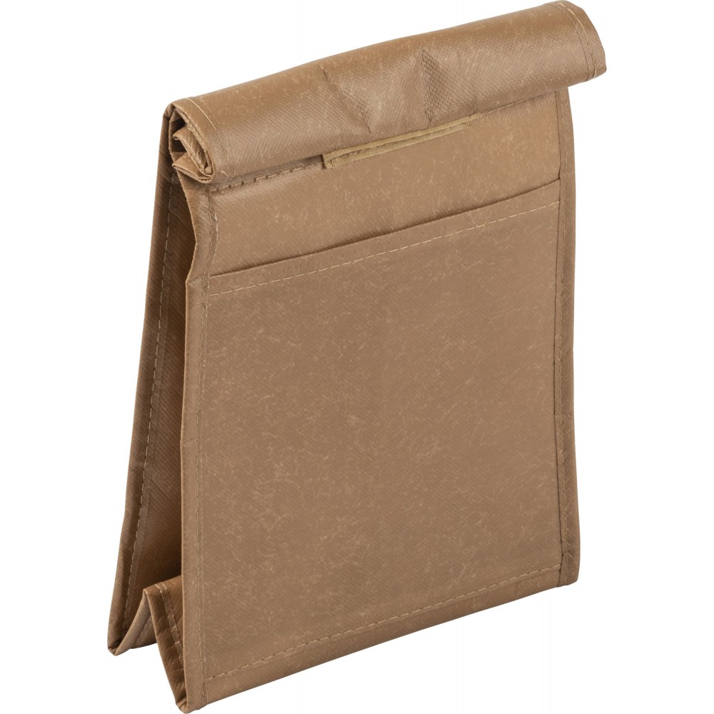 Laminált hűtőtáska barna papírzacskó design-nal. Belül szigetelő fóliával bélelve. 90 g nemszőtt, laminált anyag.