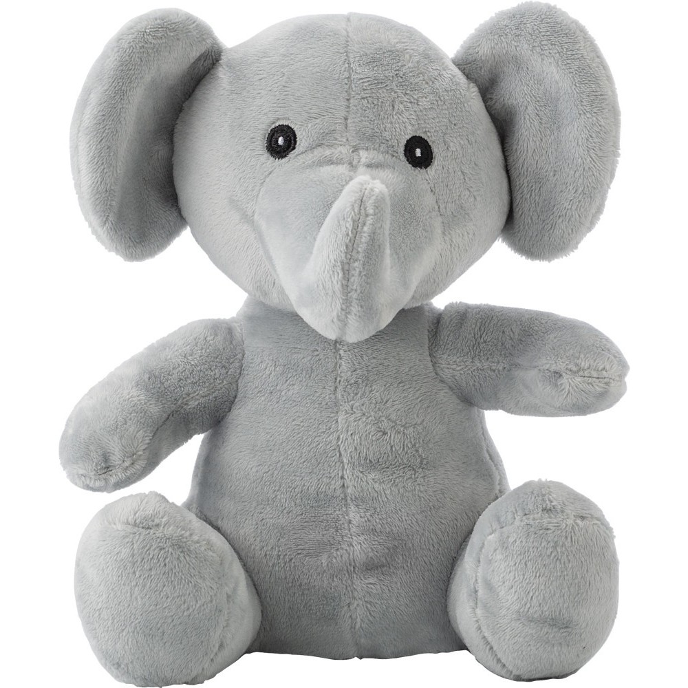 Plüsselefánt hímzett szemekkel, orral és szájjal. Csak a mellékelt címke emblémázható.
