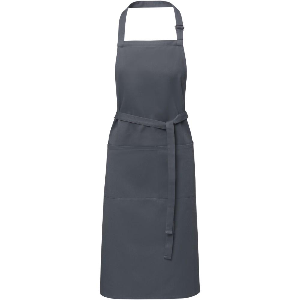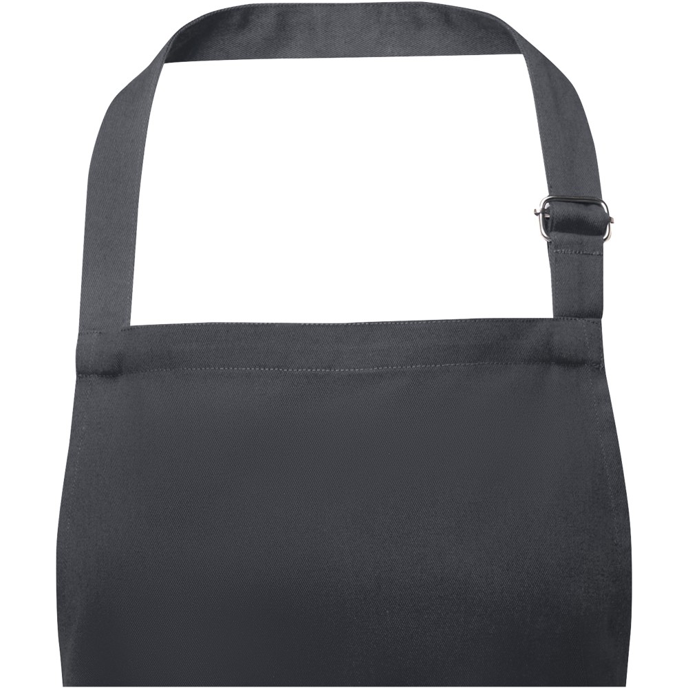 Vastag és masszív anyag, ugyanakkor puha és kényelmes viselet. A két elülső zseb gyors és egyszerű módot kínál a konyhai eszközök tárolására. A kötény nyakában csattal állítható, hátul megköthető. Nagyméretű nyomtatási lehetőség a logók megjelenítéséhez. Pamut twill 65% poliészterből és 35% pamutból, 240 g/m2.