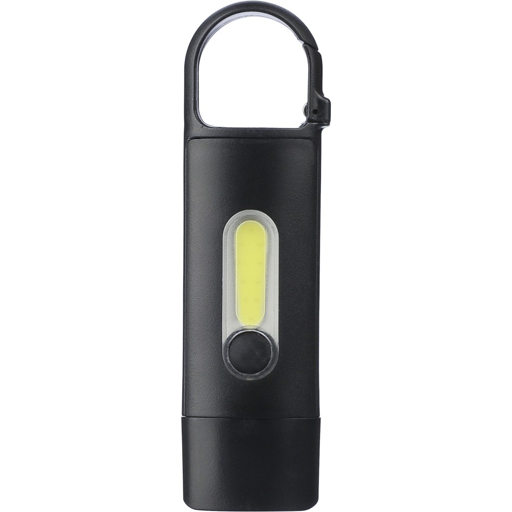 Mini elemlámpa újrahasznosított ABS anyagból, beépített 20 mAh-s, usb-n keresztül tölthető akkumulátorral és karabinerrel. Első COB lámpával és oldalsó COB fényszóróval, mely három világítási móddal rendelkezik. USB-C töltőkábellel, újrahasznosított ABS anyagot jelző logóval. Csomagolása barna papírdoboz.