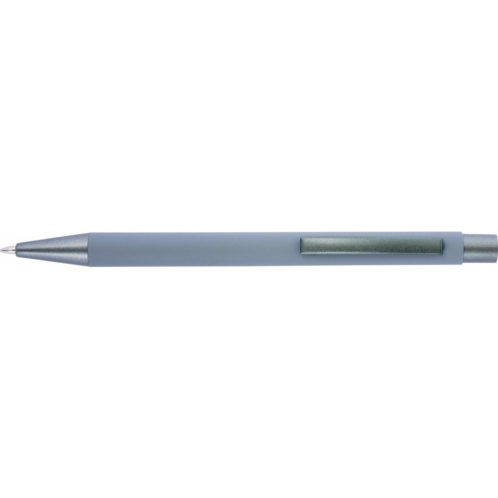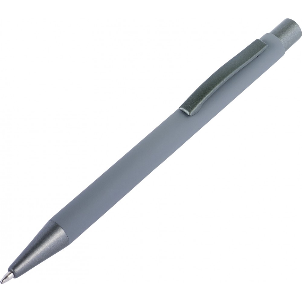 Golyóstoll gumis bevonattal, kék tollbetéttel. A hegy, klipsz és a nyomógomb egyforma sötétszürke színű. ABS, alumínium.
