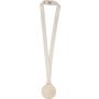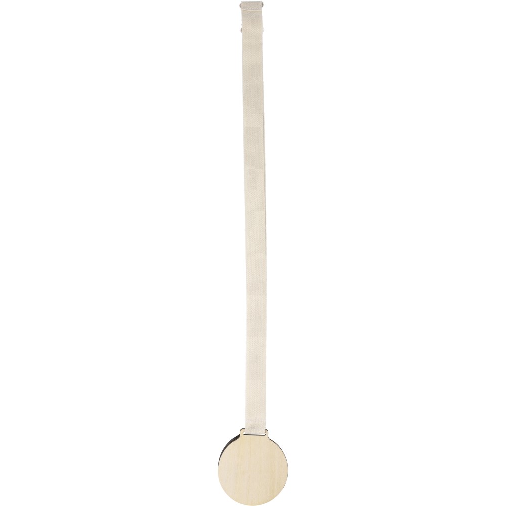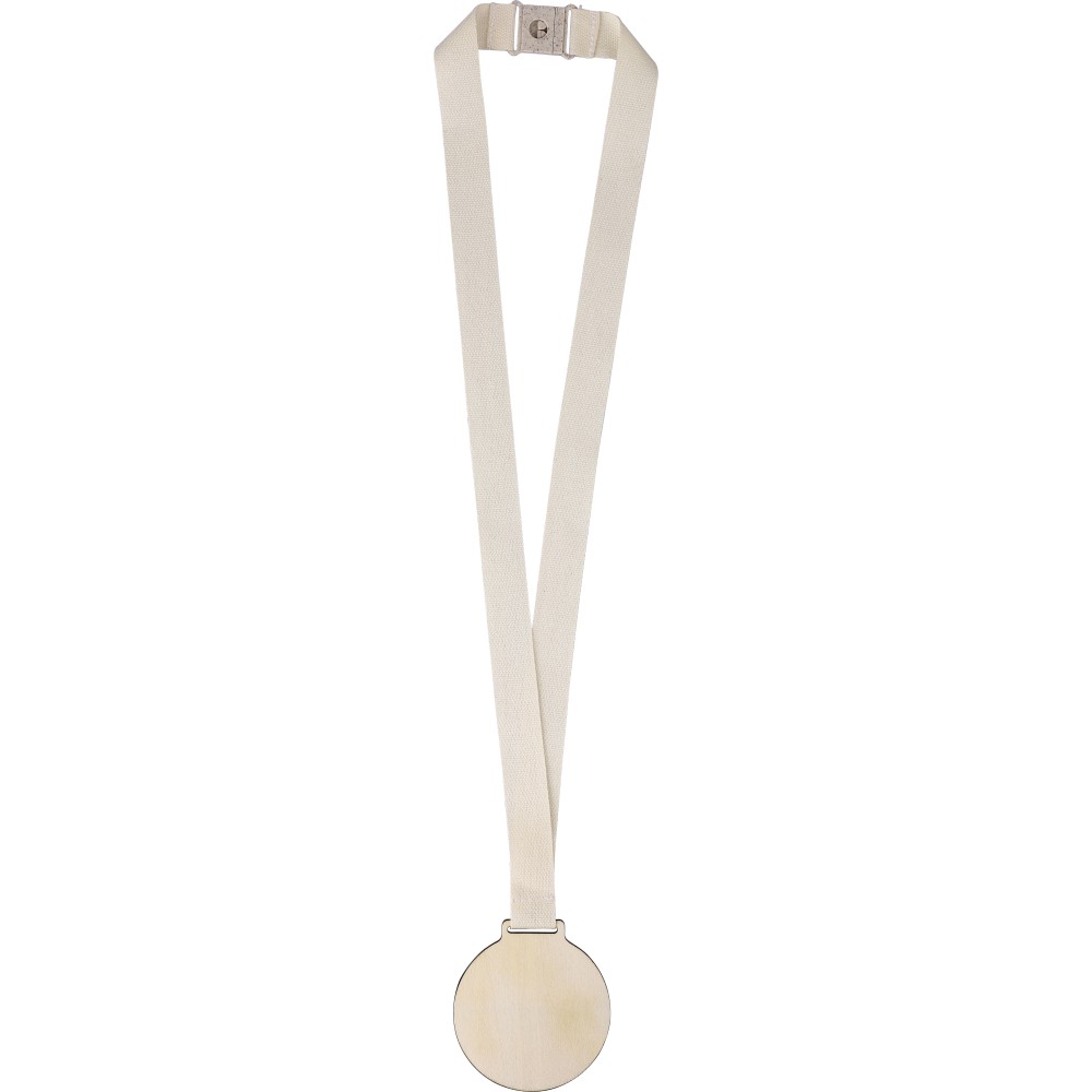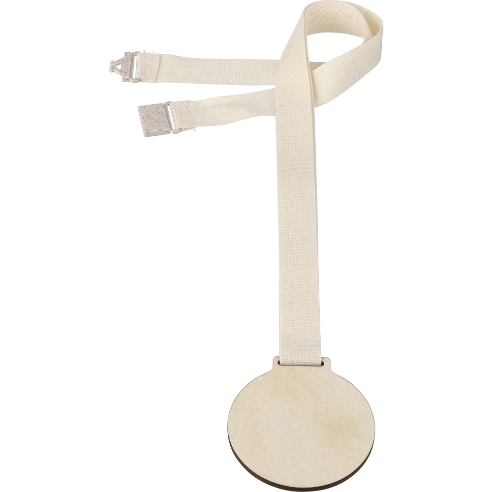 7 cm átmérőjű és 4 mm vastagságú hársfa medál 90 x 2 cm-es pamut nyakpánttal és környezetbarát búzaszalma-PP keverék biztonsági csattal a kényelem érdekében.
