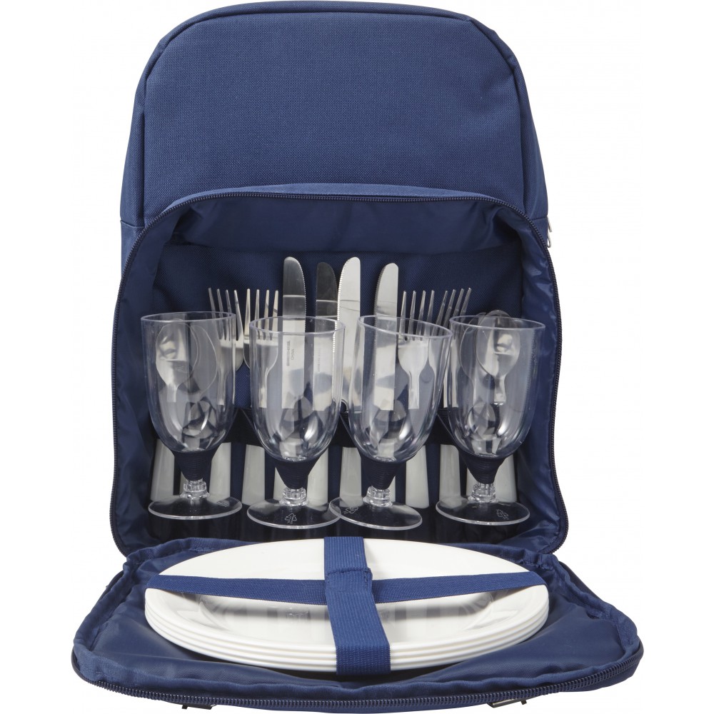 Piknikhátizsák hűtőrésszel, műanyag étkészlettel és evőeszközökkel 4 fő részére. 600D poliészter.