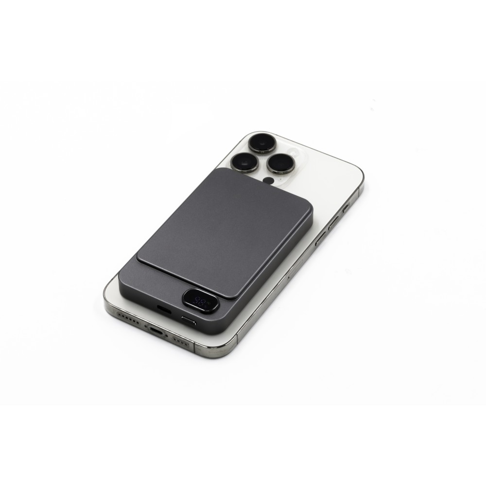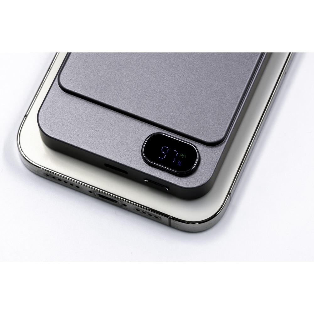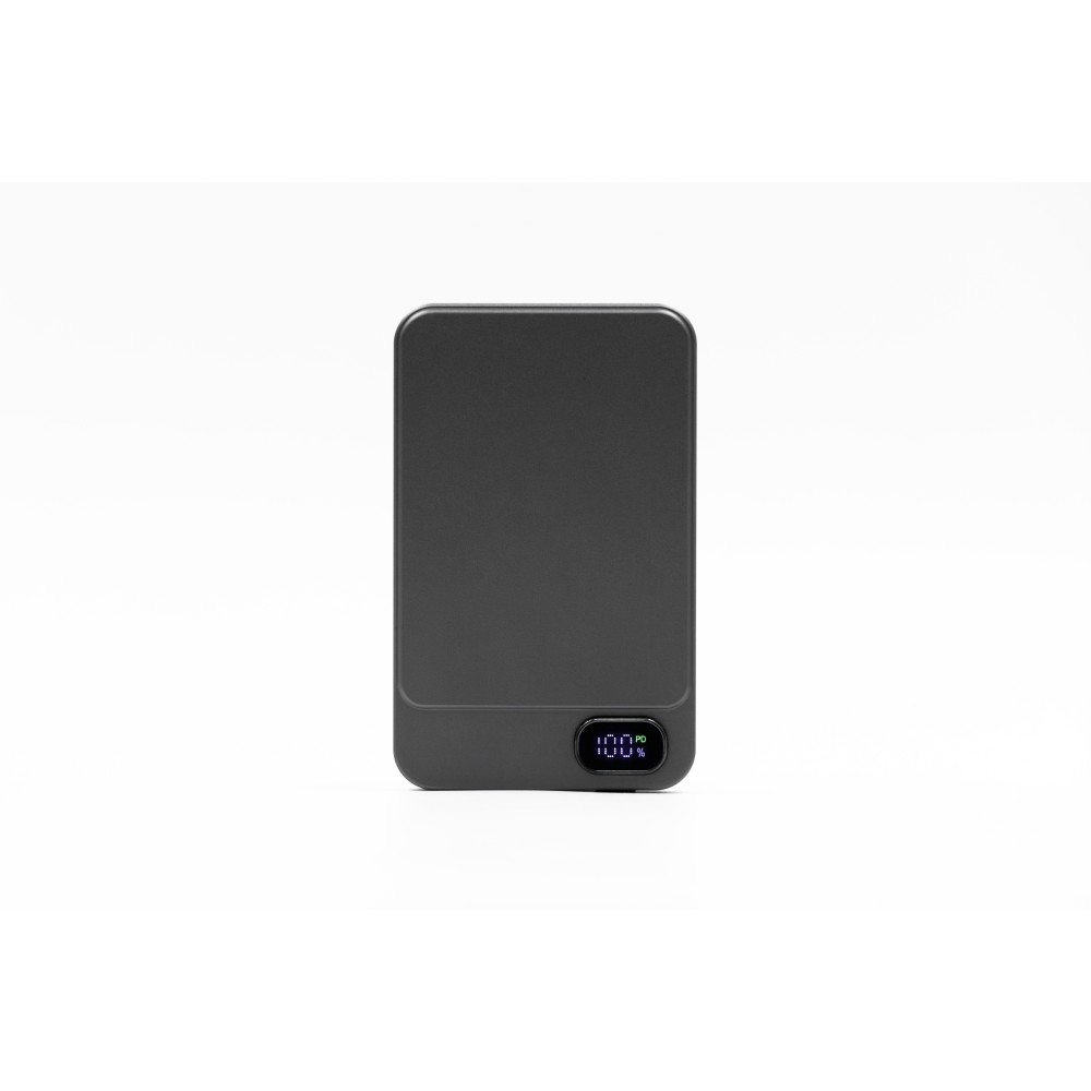 A Powerwave 5000 mAh-s powerbank vékony, alumínium unibody kialakítású, így könnyen elfér bármelyik zsebben. 5000 mAh kapacitással rendelkezik, és támogatja a 15 W-os mágneses vezeték nélküli töltést (MagSafe, Qi1 és Qi2) az egyszerű, kábel nélküli töltés érdekében. Emellett tartalmaz egy 20 W-os (PD 3.0) USB-C portot is, hogy szükség szerint tölthesse a laptopokat vagy más eszközöket. Az LCD kijelzőn látható az akkumulátor töltöttségi szintje és töltési állapota, míg az intelligens chip védelmet nyújt a túláram, a túltöltés, a túlmelegedés és a rövidzárlat ellen. Mágneses rögzítéssel tervezték a gyors és biztonságos rögzítéshez.