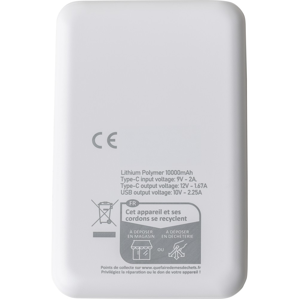 Újrahasznosított ABS anyagból készült powerbank 10 000 mAh kapacitással és 22,5 W gyors töltési teljesítménnyel. Type-C in/out és Type-A bemenettel, digitális kijelzővel, sima és texturált felülettel. Biztonsági védelmekkel ellátva. A hátoldalon gravírozott recycled (újrahasznosított) alapanyagra utaló logó található. Selyempapírral bélelt barna dobozba csomagolva.