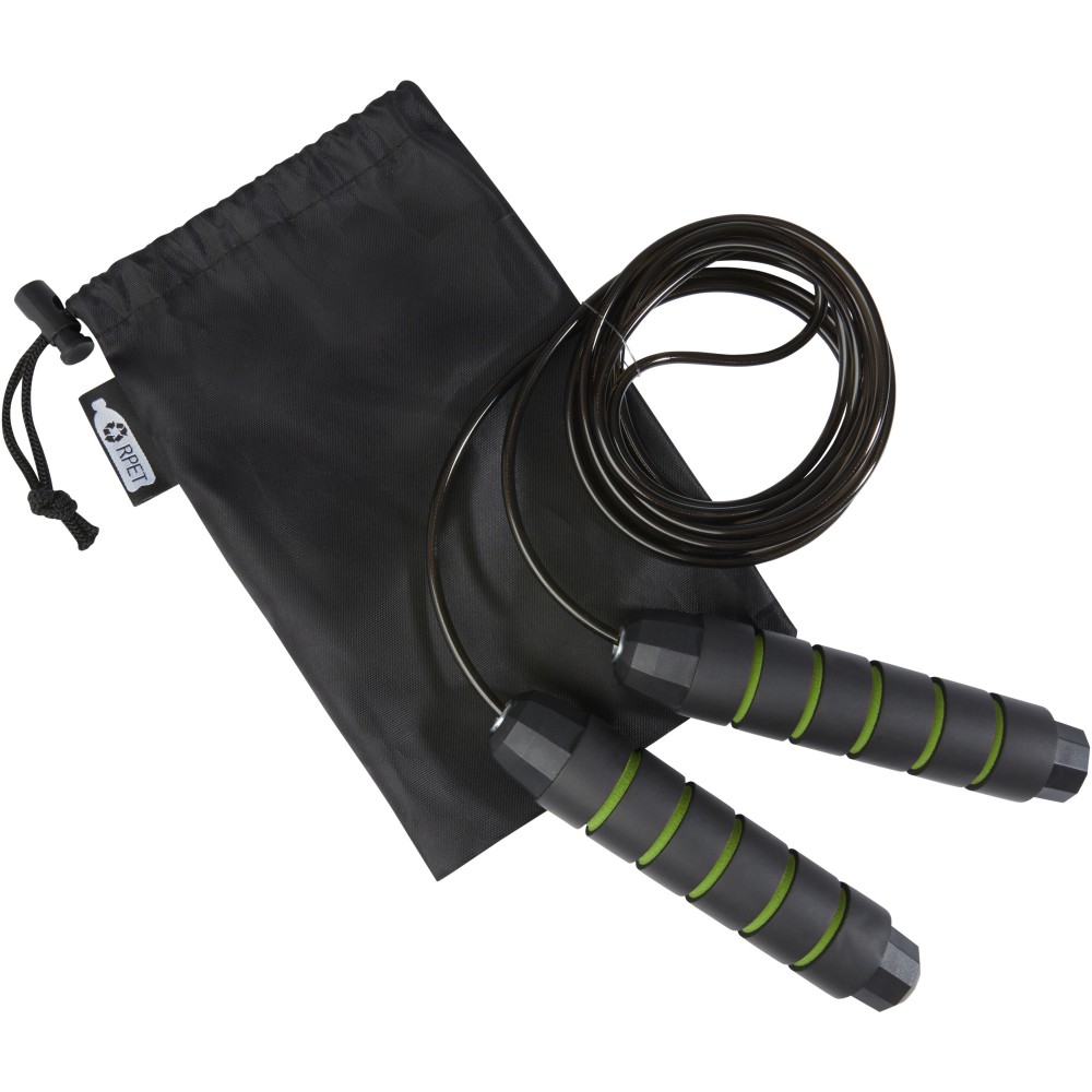 Professzionális ugrálókötél felnőtteknek, ergonomikusan kialakított puha habszivacs fogantyúkkal, mely szilárd és kényelmes fogást biztosít edzés közben. A kötél hossza 310 cm, ami könnyű ugrást tesz lehetővé felnőttek számára 195 cm hosszúságig. A kötél hossza állítható, és beépített, kiváló minőségű, 360 fokban forgatható, nagy sebességű golyóscsapággyal rendelkezik, amely biztosítja a zökkenőmentes, könnyed forgást és elkerüli a gubancolódást. Újrahasznosított PET műanyagból készült tároló tasakkal (21 x 14 cm) szállítjuk, amely remek helyet biztosít a logó nyomtatásához.