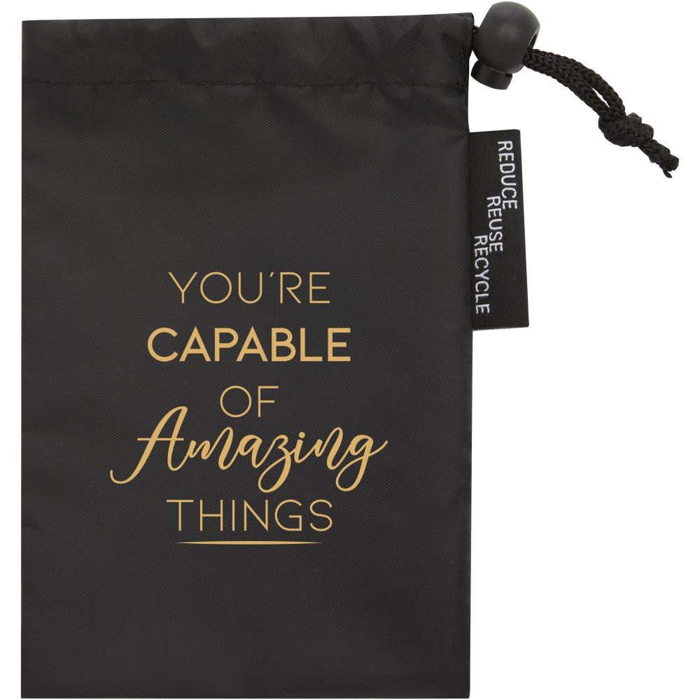 Újrahasznosított poliészterből (RPET) készült jógaszalag. Az RPET használata segít csökkenteni a pazarlást és elősegíti a környezet fenntarthatóságát. Az újrahasznosított műanyagok felhasználásával az új műanyagok keletkezése minimálisra csökken, így fenntarthatóbb választás. Mérete: 181 x 3,8 cm. A tasak is RPET-ből készült.