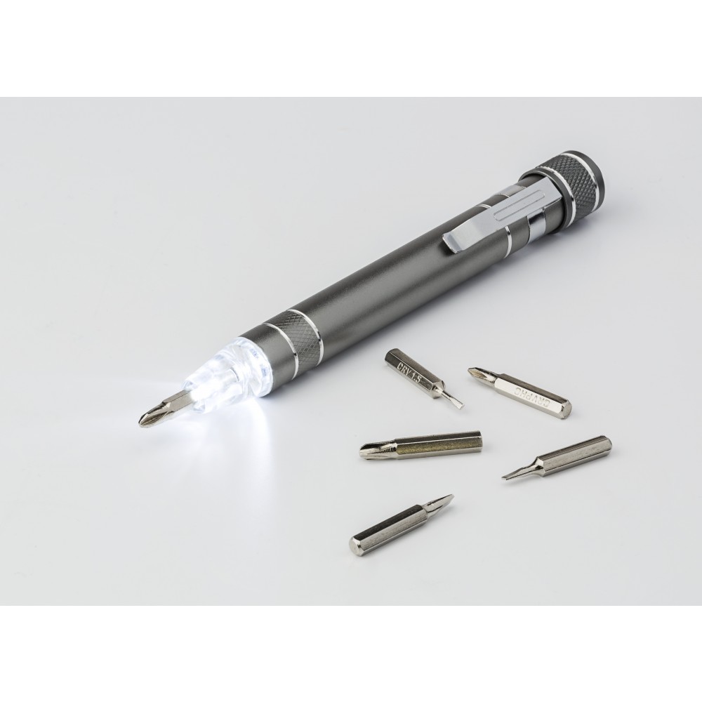 Alumínium csavarhúzókészlet lámpával. Tartalma: 3 db lapos csavarhúzó és 3 db csillagcsavarhúzó. Az elemet tartalmazza.