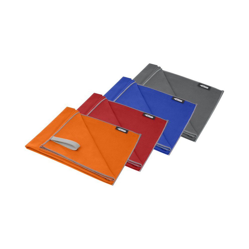 Ez a sporttörölköző nagyon jó nedvszívó, könnyű és gyorsan szárad. Ha a törölközőt összehajtjuk és gumiszalaggal rögzítjük, kis mérete miatt alkalmas edzőterembe, uszodába, vagy kempingezésre. A törölköző 130 x 80 cm méretű, 200 gr/m2-es újrahasznosított PET poliamidból készült, mosógépben 40°C-on mosható. Újrahasznosított PET műanyagból készült tároló tasakkal (20 x 8,5 cm) szállítjuk, amely remek helyet biztosít a logó nyomtatásához.