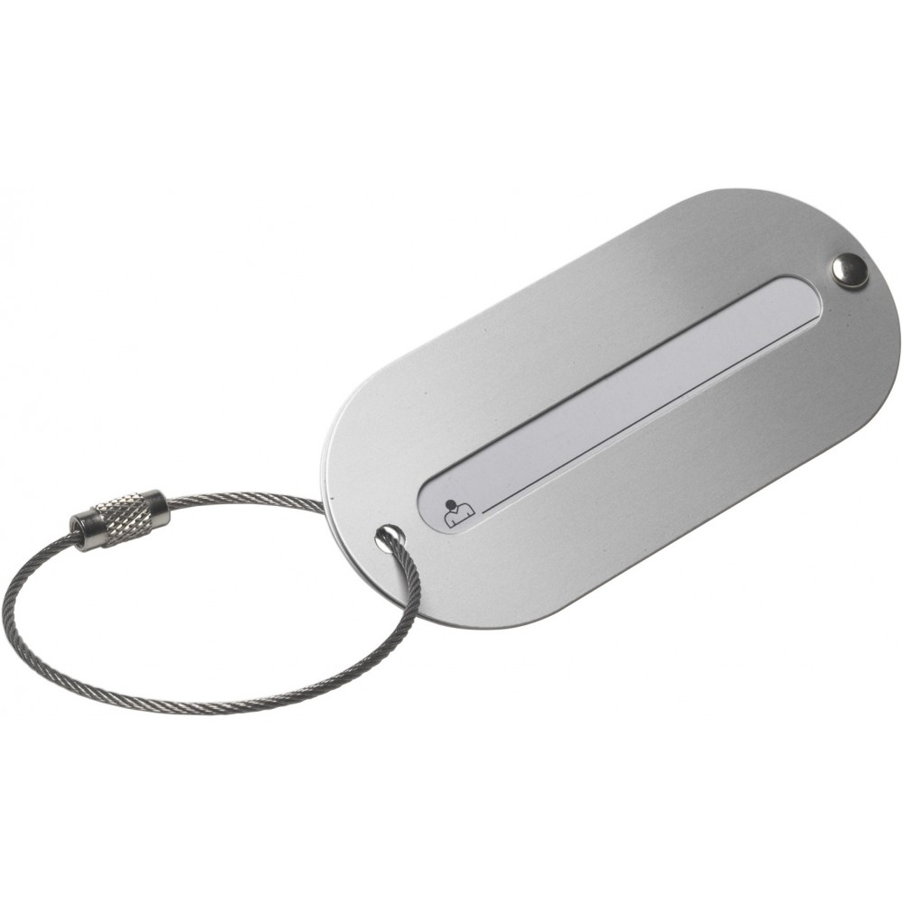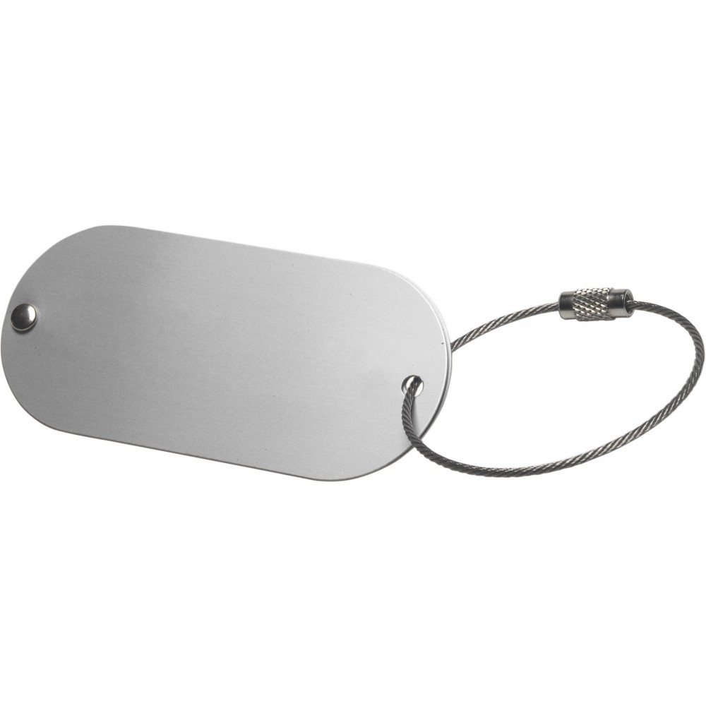 Poggyászazonosító alumínium tábla, fém sodort huzalon.
