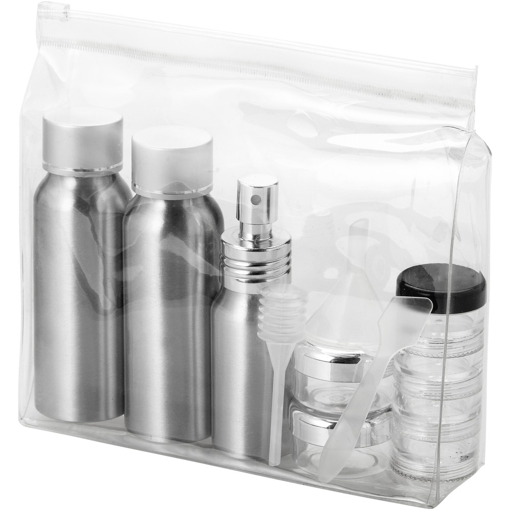 Fedélzetre vihető készlet. Tartalma: 2 x 80 ml-es alumínium palack, 1 x 30 ml-es alumínium spray palack, 2 x 15 grammos tégely, 1 x 4 rétegű tégely, tölcsér, spatula és szívóka. A flakonok és a tölcsér stb. polietilén zacskóban, elkülönítve a tasaktól.