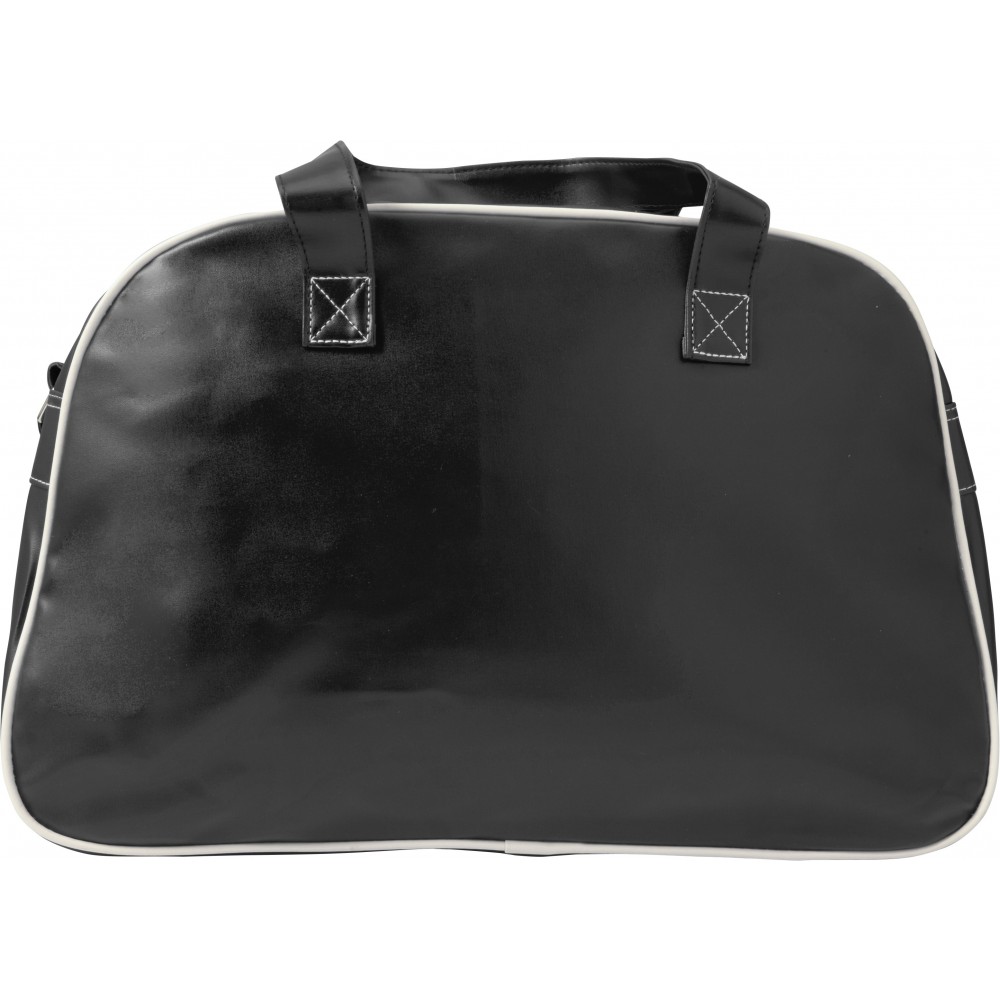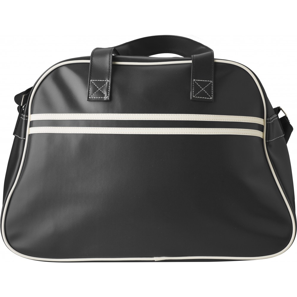 Sporttáska fehér csíkokkal és szegéllyel, állítható vállpánttal. PVC.