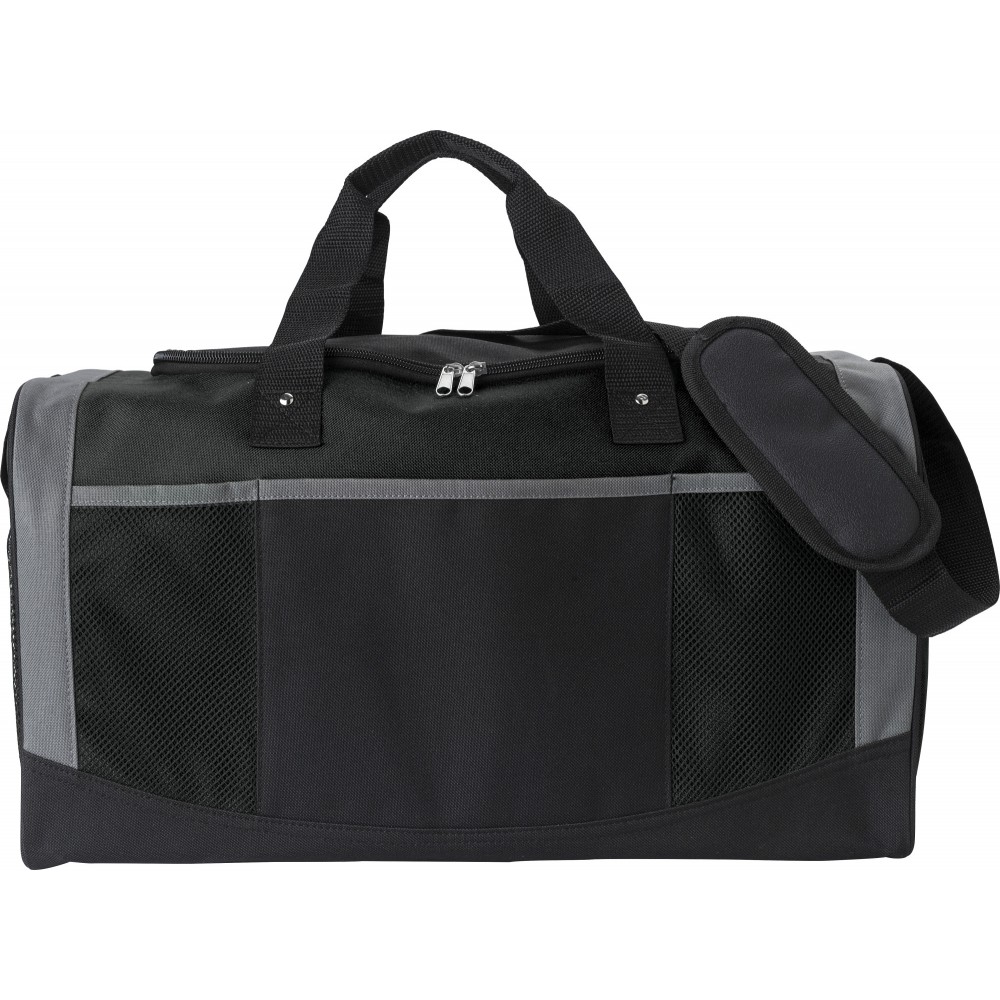 Sporttáska rövid fogantyúval és állítható vállpánttal. Egy nagy rekesz cipzárral, egy hálós zseb az oldalán, 3 elülső zseb. Megerősített alj. Poliészter 600D.