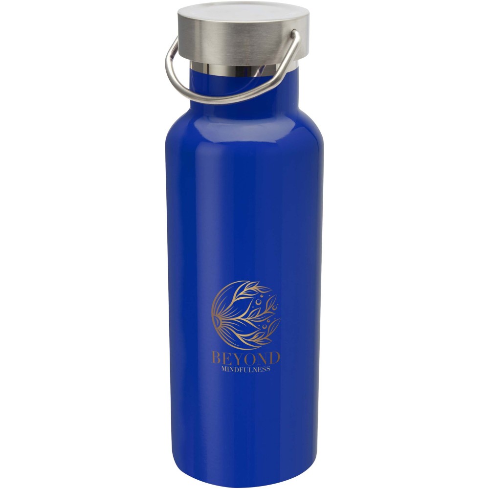 Tartós, dupla falú vákuum szigetelésű, RCS tanúsítvánnyal rendelkező rozsdamentes acél palack csavaros kupakkal és fogantyúval. Űrtartalma: 500 ml. Cseppálló. Ajándékdobozba csomagolva szállítjuk.